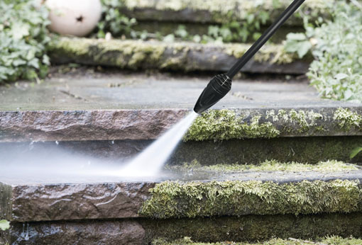 Очистка дорожек и стен, покрытых мхом или серым налетомГрязевая фреза вкупе со струей под высоким давлением выбивают мох из самых пор камня, при этом не повреждая саму каменную поверхность.