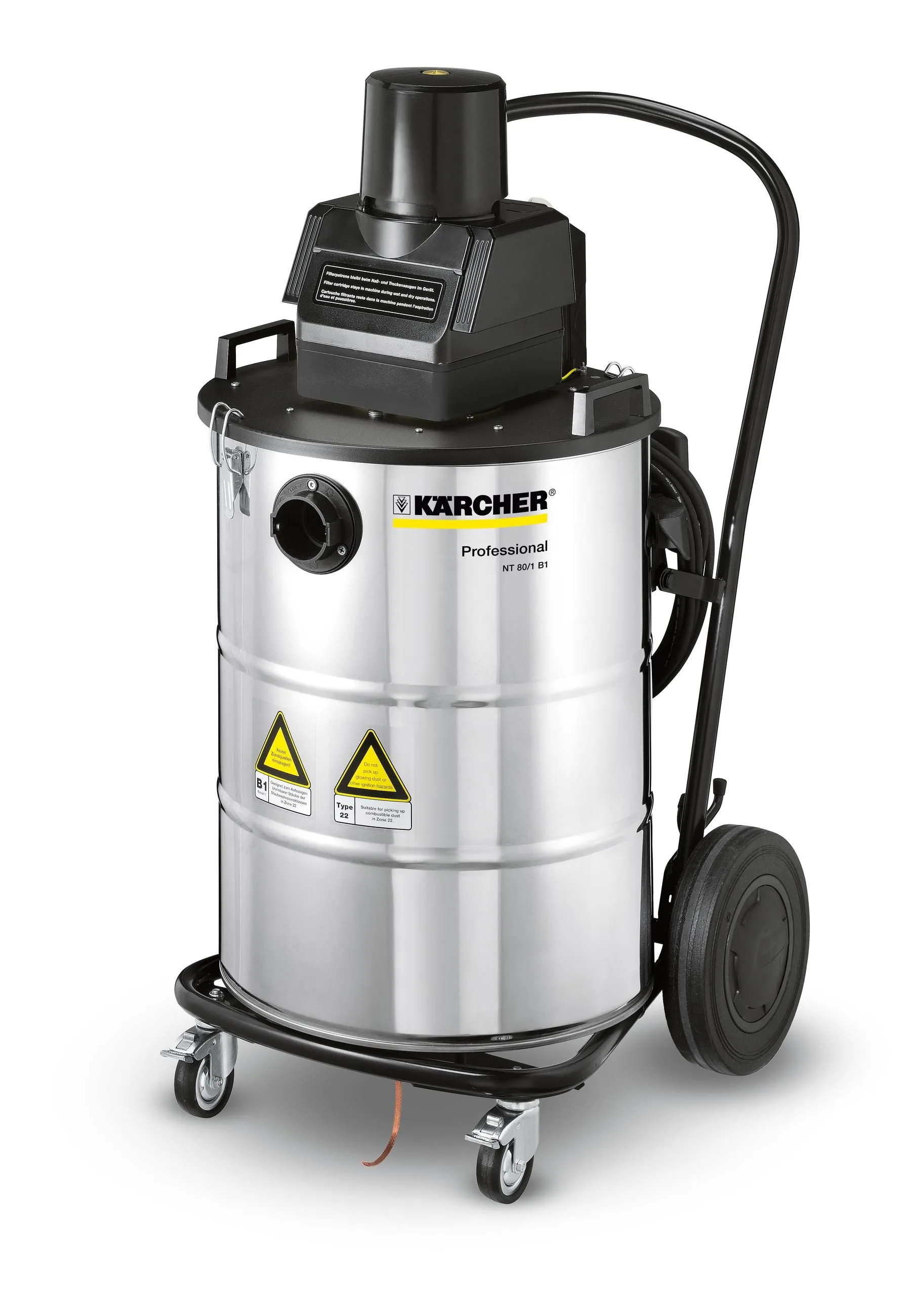 Надежный промышленный пылесос влажной и сухой уборки Karcher NT 80/1 B1 M разработан для эксплуатации в особо сложных условиях, где возникает кратковременная взрывоопасная обстановка (промышленные заводы, военные части и склады, деревообрабатывающие цеха и пр.). Корпус данного аппарата выполнен из прочной нержавеющей стали, а все внутренние узлы – из антистатических материалов.