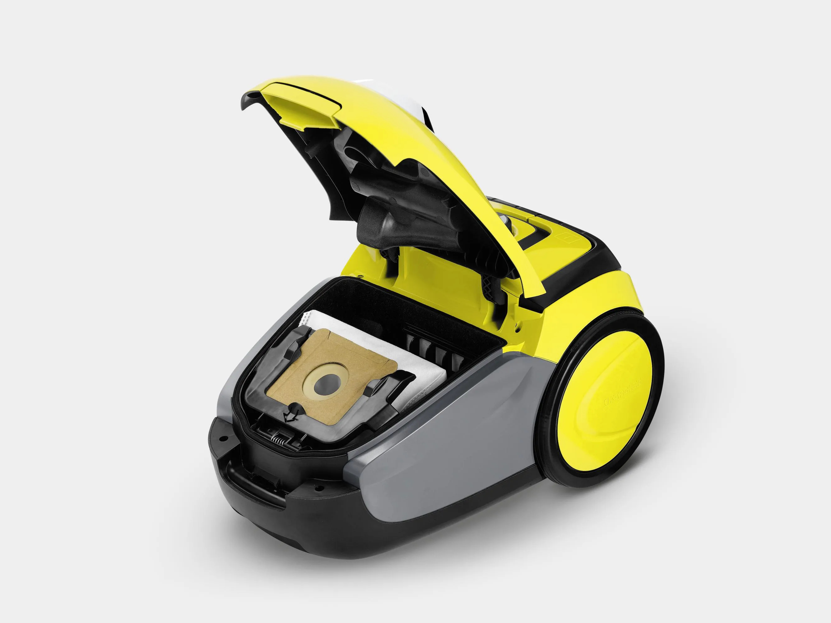 Karcher VC 2 обладает ярким функциональным дизайном. Эргономичная ручка и большие колеса позволяют легко и удобно транспортировать пылесос к месту назначения. Электрический кабель сматывается автоматически, стоит только за него потянуть. Шланг с удлинительной трубкой и насадкой для пола во время перерыва в уборке аккуратно “паркуется” на корпусе пылесоса. При этом на корпусе модели есть специальный отсек для хранения входящих в базовую комплектацию насадок. Таким образом, они не потеряются и будут всегда под рукой.